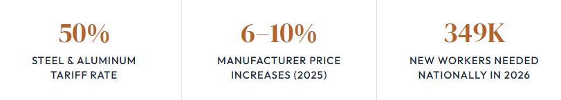 The 50% steel and aluminum tariffs show no signs of reduction. Industry forecasts project domestic steel prices holding steady or rising slightly through the remainder of 2026. The labor shortage is structural — driven by retirements and demographics — not a temporary slowdown that will correct itself.